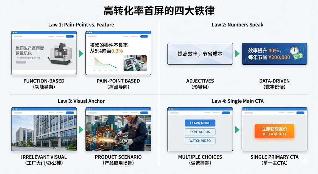 - 视觉锚定:首屏背景图必须是产品应用场景,而非工厂大门或办公楼